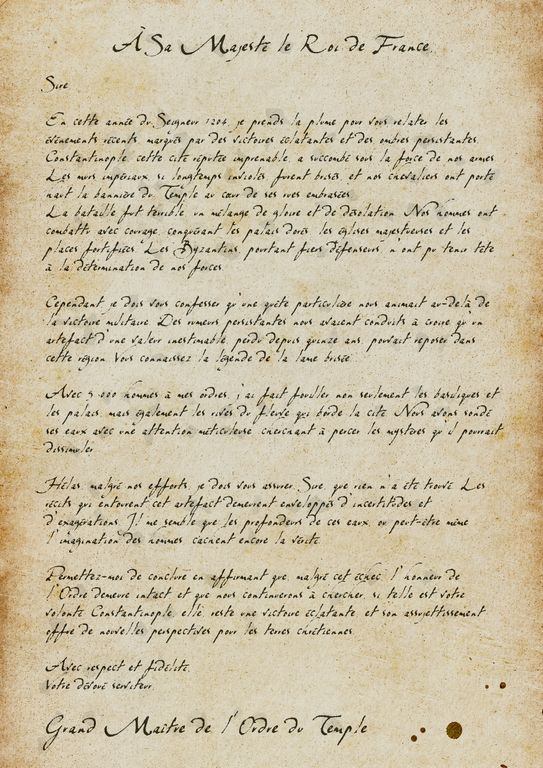 L’expérience de jeu repose sur une immersion progressive et captivante dans une histoire riche en péripéties et en rebondissements, conçue pour intriguer, surprendre et captiver les joueurs du début à la fin. L’histoire se déroule en trois chapitres distincts, chacun révélant de nouvelles facettes du mystère du Graal. Les énigmes et les indices sont intégrés de manière organique à l’intrigue, vous plongeant dans une progression logique et fluide qui maintient un suspense constant. Les joueurs sont accompagné les joueurs tout au long de l’aventure par une interface digitale avec des contenus interactifs (vidéos, module 3D de jeux, enregistrements...). En combinant des éléments physiques (cartes, documents) et numériques (indices visuels et sonores, interactions virtuelles), le jeu vous fait sentir comme un véritable acteur de l’Histoire.
