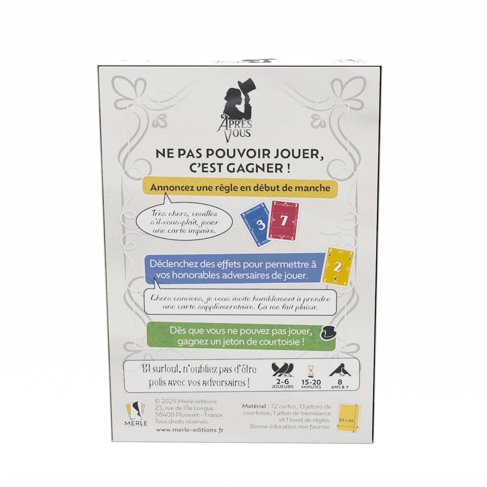Et n’oubliez pas, Après-vous n’étant fait que pour les personnes courtoises, à chaque fois que vous devrez formuler une demande aux autres joueurs, vous devrez y intégrer une formule de politesse !