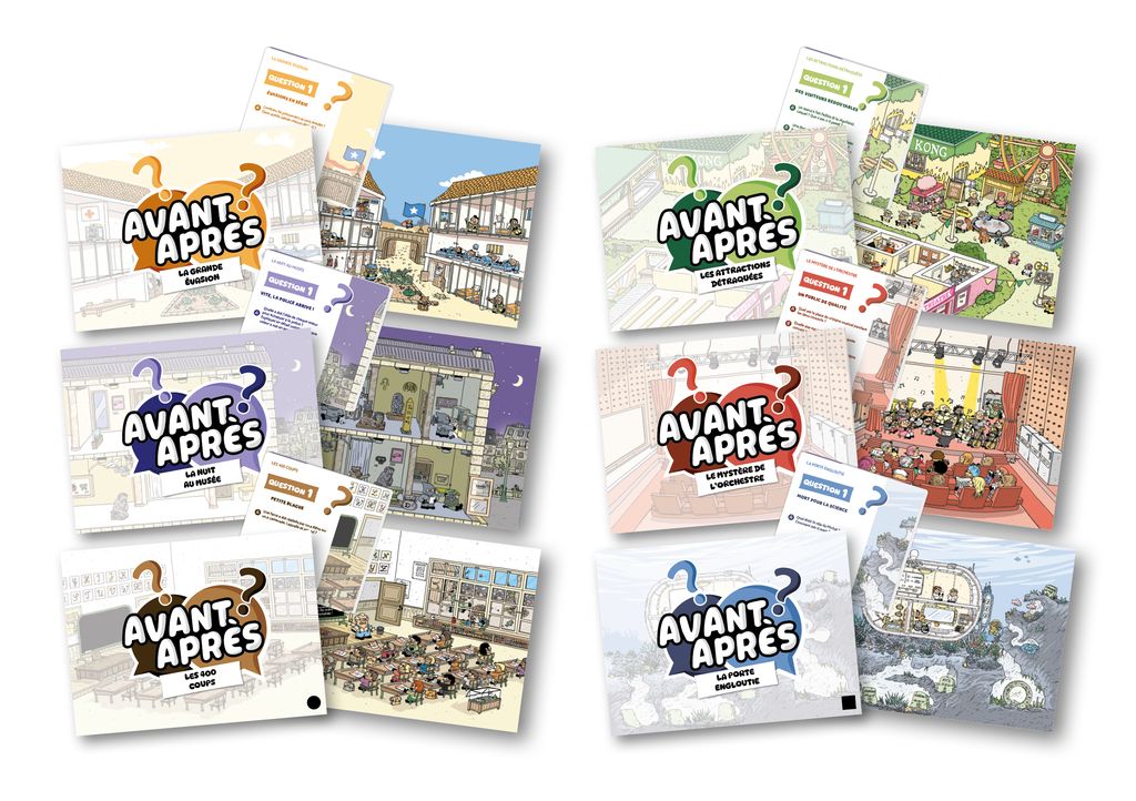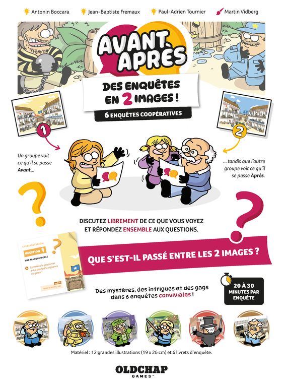 Dans ce jeu d’enquête coopératif, répartissez-vous en deux groupes et choisissez une enquête parmi les 6 proposées. Un groupe reçoit l’illustration « Avant » et l’autre reçoit l’illustration « Après » mais vous ne savez pas qui a reçu quelle illustration. Comprenez ensemble tout ce qui s’est passé entre vos deux scènes... sans jamais montrer votre illustration à l’autre groupe ! Décrivez tous les détails, prenez votre temps, et écoutez bien les autres pour répondre aux questions du livret.