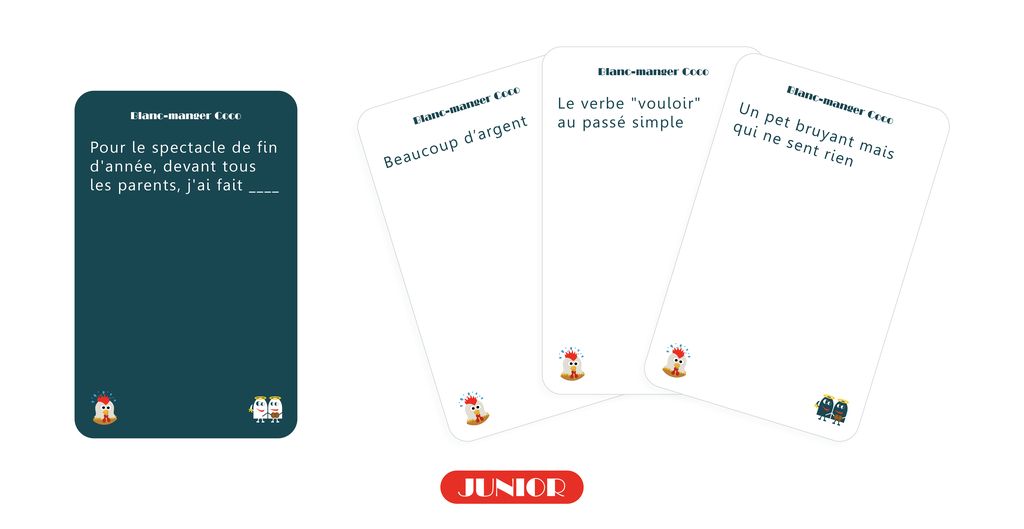 Dans Blanc-manger Coco Junior 2, les joueurs créent des combinaisons hilarantes en comblant des phrases à trou. Ce jeu est la version adaptée aux enfants du jeu pour adultes Blanc-manger Coco