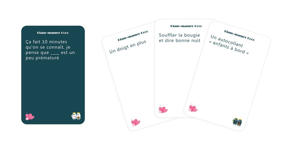Au début de la partie chaque joueur reçoit 11 cartes Réponse. Un premier joueur, le Question Master, pioche une carte Question, composée d’un texte à trou, et la lit aux autres joueurs. Chacun choisit la carte Réponse qu’il trouve la plus drôle pour compléter la phrase, et la transmet face cachée au Question Master. Le Question Master lit les Réponses et sélectionne celle de son choix. Celui qui l’a jouée marque un point. Pour gagner, il faudra réussir à faire les associations de cartes les plus délicieusement drôles ! Grâce à des règles expliquées en 1min, on peut se lancer immédiatement dans une partie de Blanc Manger Coco : la Petite Gâterie. À l’apéro ou en soirée, c’est le jeu d’ambiance tout indiqué pour rire de tout ! Cette édition est particulièrement efficace pour célébrer les EVG et EVJF, rire entre couples ou juste entre adultes à l’heure de l’apéro.