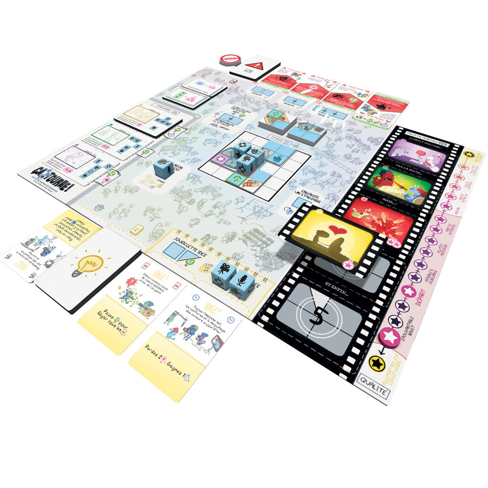 Dans ce jeu coopératif, œuvrez ensemble à la création du meilleur film possible ! À votre tour, vous assignez à l’équipe différentes actions sur le plateau principal, sur votre plateau individuel, ou dans le Studio, pour filmer des Scènes. Vous gagnez si vous terminez un film de Qualité ou s’il est Tellement Nul que cela en devient Génial ! Vous perdez si vous manquez de temps ou d’argent pendant la production, ou si votre film est de Qualité médiocre.
