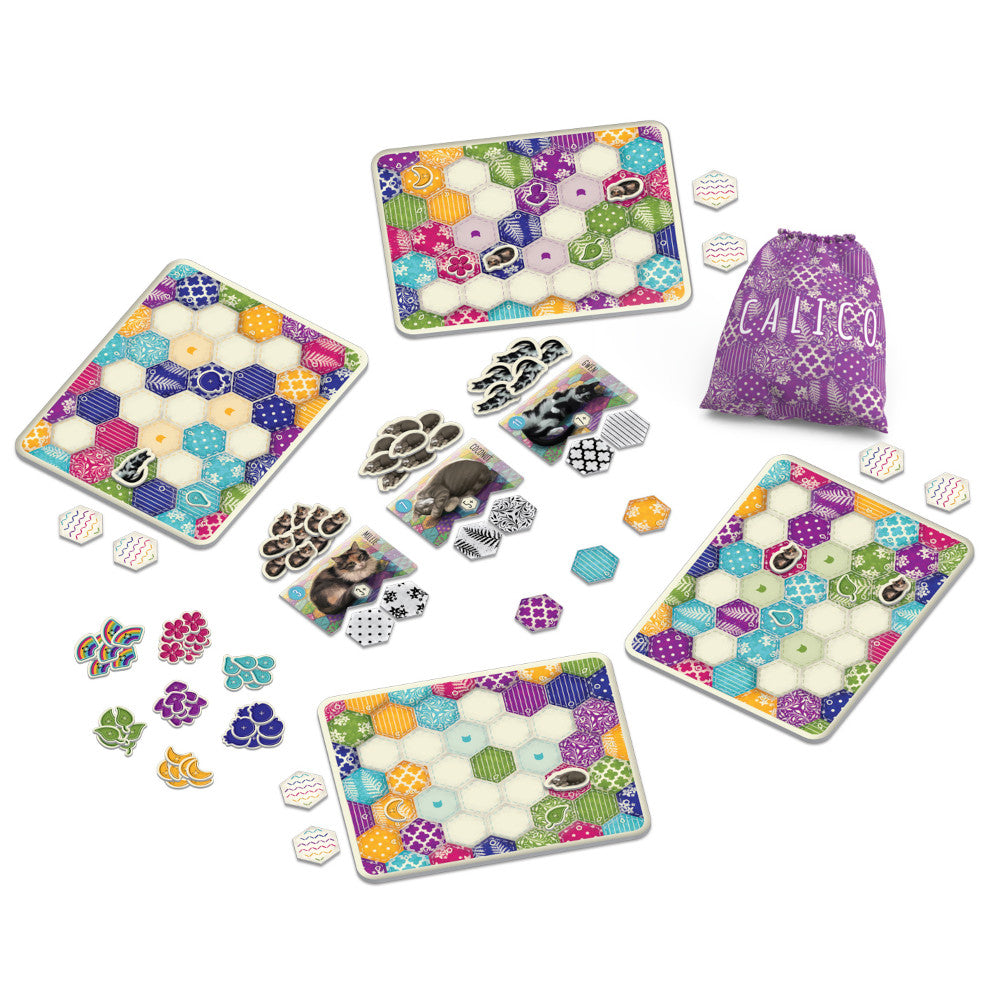 Dans Calico, les joueurs, en compétition les uns contre les autres, vont tenter de composer le quilt le plus douillet en draftant et en plaçant des tuiles de tissus de différentes couleurs et différents motifs sur leur plateau de quilt. Chaque plateau de quilt comporte 3 objectifs de réalisation qui rapporteront des points si les prérequis sont respectés. Les joueurs vont également tenter de composer des groupes de motifs afin d’attirer les Chats les plus câlins, et d’obtenir des regroupements de couleurs sur lesquels coudre des boutons. Le joueur qui gagnera le plus de points grâce à ses objectifs de réalisation, ses Chats et ses boutons l’emportera!