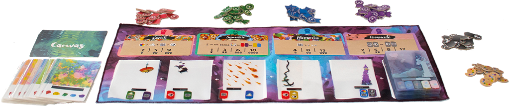 Dans Canvas, les joueurs incarnent des peintres participant à un concours d’art. Les joueurs collectionnent des cartes sur fond transparent (dont on fait l’acquisition grâce à des pions Inspiration). En superposant 3 d’entre elles, le peintre crée sa propre toile unique. Chaque carte affiche également un ensemble d’icônes qui seront visibles ou cachées en fonction de l’ordre de superposition. Chaque peinture est notée sur la base d’un ensemble de critères qui changent à chaque partie. Quand chaque joueur a créé 3 tableaux, la partie se termine.