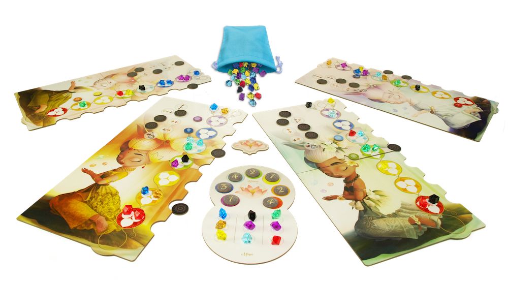 Chaque joueur possède un plateau représentant les 7 Chakras qu’il doit remplir de gemmes symbolisant l’énergie qui circule dans son corps. Pour marquer des points, un joueur doit harmoniser le mieux possible chacun de ses Chakras. Pour cela il doit obtenir des gemmes et en positionner 3 de la bonne couleur dans chacun des Chakras. A son tour, le joueur actif (qui démarre la partie avec plusieurs jetons Inspiration) a le choix parmi trois actions : - Récupérer jusqu’à 3 gemmes d’une colonne et les positionner en haut de son plateau personnel ou, en dépensant un jeton, les placer à un endroit plus stratégique. - Utiliser, en échange d’un jeton, une action disponible : faire circuler ses gemmes, vers le haut ou vers le bas, d’autant de cases chakras qu’indiqué sur l’action est au coeur du jeu pour espérer un alignement parfait. - Méditer afin de récupérer les jetons Inspiration utilisés et regarder secrètement la valeur de points, commune à tous les joueurs, que rapporte un chakra harmonisé (qui possède 3 gemmes d’une même couleur). Lorsqu’un joueur parvient à harmoniser 5 de ses chakras, le dernier tour survient avant de comptabiliser les points gagnés par chacun.