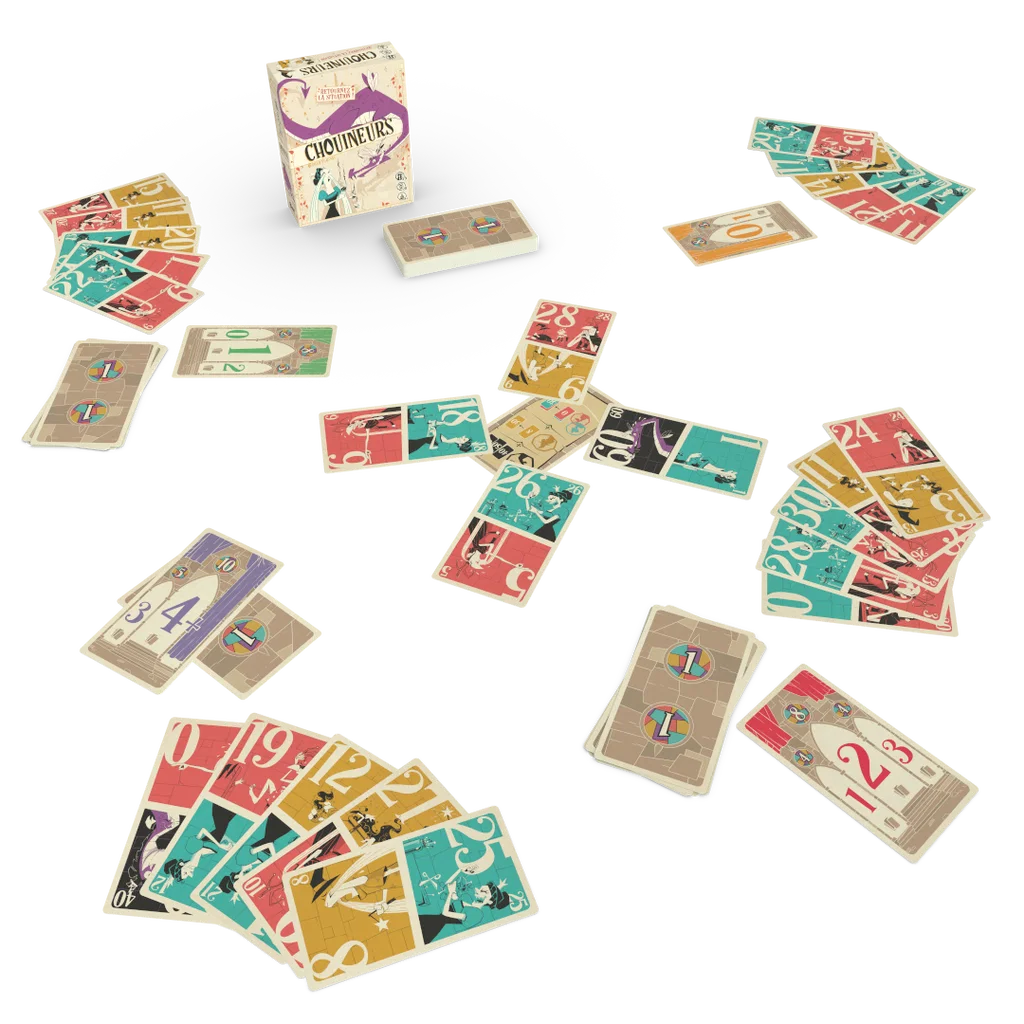 Chouineurs est un jeu de plis. Classiquement, vous devrez "suivre", mais vous pourrez aussi "couper", "pisser", et même "chouiner" ! Au début de chaque manche, vous devez choisir dans quel sens jouer les cartes de votre main. Dépendant de ce choix, vous pariez sur le nombre de plis que vous pensez remporter lors de la manche. Lors d'un pli, la couleur doit être suivie si possible. Sinon vous pouvez "couper", ou "pisser". Vous avez aussi la possibilité de "super-couper", même si vous avez la couleur demandée ! Enfin et surtout, si vous jouez la carte de plus petite valeur du pli, vous "chouinez" et pouvez alors gagner un point ou retourner une carte de votre main, et adapter ainsi votre jeu ! Après sept plis, la manche est finie. Chacun gagne des points s'il a réussi son pari ou s'il a "chouiné" durant la manche. Au terme de la quatrième manche, le joueur avec le plus haut score l'emporte.