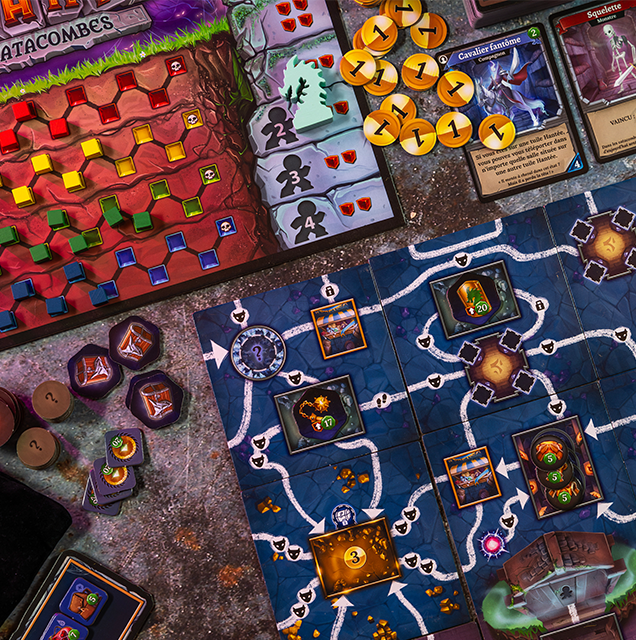 CLANK!™ Catacombes est un deck-building d’aventures. Mais c’est quoi le deck-building ? Au fil de l’aventure, faites l’acquisition de meilleures cartes que celles de votre paquet (deck) de départ. Améliorez ainsi vos actions en recrutant des alliés et en obtenant des objets pour votre quête. Chaque partie de CLANK!™ Catacombes est unique, car ce sont les tuiles que vous agencez qui créent le plateau de jeu au fur et à mesure.