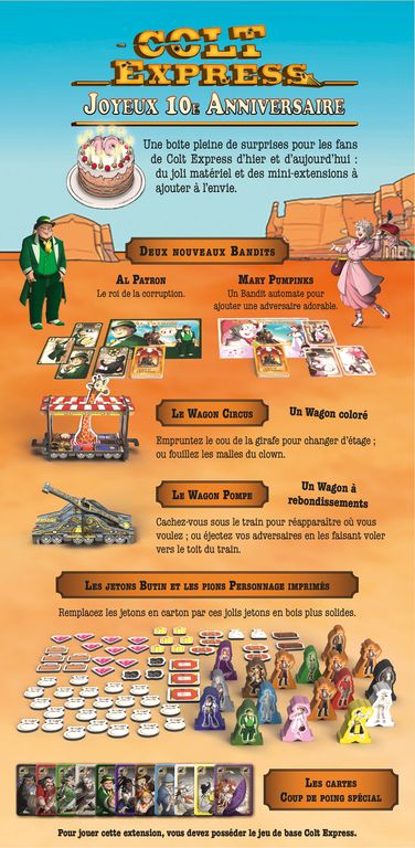 Colt Express fête ses 10 ans cette année (et oui, déjà !) alors nous avons conçu une boîte pour les fans d’hier et de demain. Mais qu’est-ce qu’il y a dans cette boîte ? • LE WAGON CIRCUS Empruntez le cou de la girafe pour changer d’étage ; ou fouillez les malles du clown. • LE WAGON POMPE Cachez-vous sous le train pour réapparaître où vous voulez ; ou éjectez vos adversaires en les faisant voler vers le toit du train. • DES JETONS ET PIONS SÉRIGRAPHIÉS EN BOIS Remplacez les jetons en carton par ces jolis jetons en bois plus solides. • DEUX NOUVEAUX BANDITS Al Patron, le Roi de la corruption & Mary Pumpinks, un Bandit automate pour ajouter une adversaire adorable. • LES CARTES COUP DE POING SPÉCIAL Le Bandit ciblé par un Coup de poing spécial n’est pas envoyé dans un Wagon adjacent, mais change d’étage.