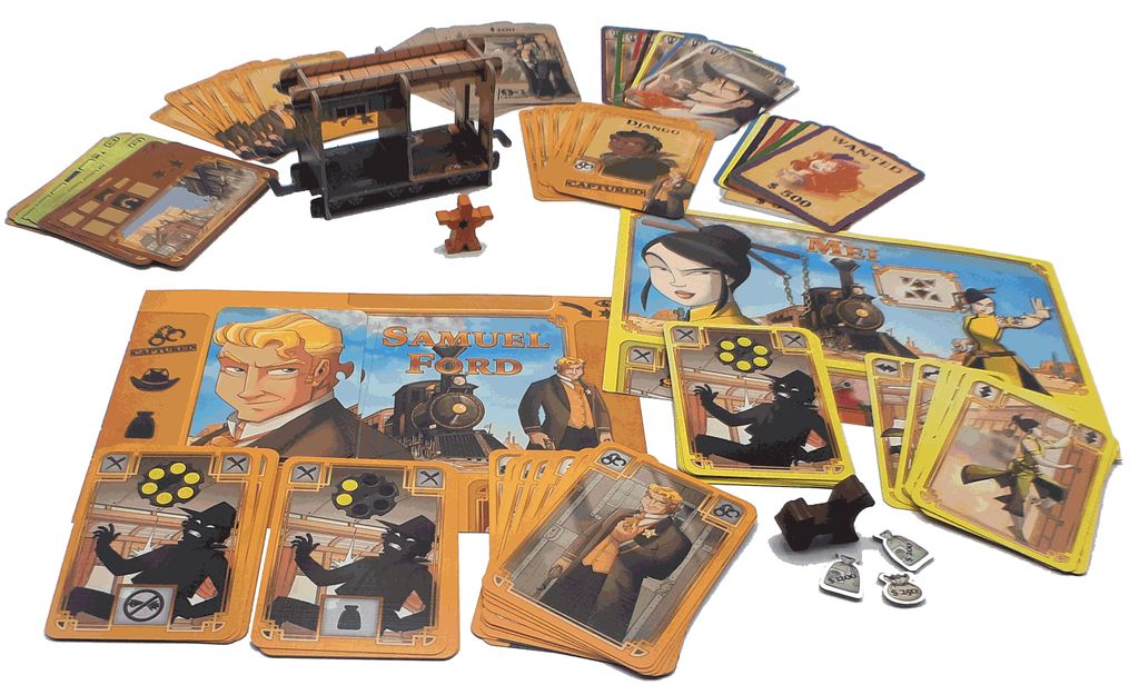 Une extension asymétrique où l’on peut incarner le Marshal. Seul contre tous les bandits, avec ses propres objectifs et des cartes Action survitaminées, un challenge face aux Bandits et leur nouvelle recrue : Mei. Tous contre un et chacun pour soi ! Liguez vous contre le Marshal mais n’oubliez pas qu’il n’y aura qu’un seul vainqueur. COMMENT JOUER Cette extension se joue avec le jeu de base Colt Express et peut se combiner avec l’extension Chevaux & Diligence. Un joueur choisit d’incarner le Marshal. Il a des cartes Action différentes des Bandits. Il peut les emprisonner ou les empêcher de jouer en leur tirant dessus avec des balles spéciales. Son but pour gagner : réaliser 4 de ses 5 objectifs à la fin de la partie. Un nouveau Bandit apparait : Mei. Cette acrobate accomplie change de wagon en même temps qu’elle change d’étage. Les Bandits conservent le même objectif que dans le jeu de base : être le plus riche. Ils peuvent tirer sur le Marshal ou même lui donner un coup de poing et devenir l’As de la castagne. Mais attention à ne pas finir en prison. La prison retient les bandits tant qu’ils n’ont pas d’Idée Géniale pour se libérer. C’est dans le wagon prison qu’ils rencontreront les prisonniers, véritables fanboys qui les suivront et les aideront durant la partie. Cette extension, assez technique, vous offre aussi de nouvelles cartes Manche, comme le Repenti qui fait gagner le Marshal avec le joueur le moins riche par exemple... Points forts Jusqu’à 8 joueurs. Un mode de jeu tous contre un. De nouveaux objectifs de jeu.