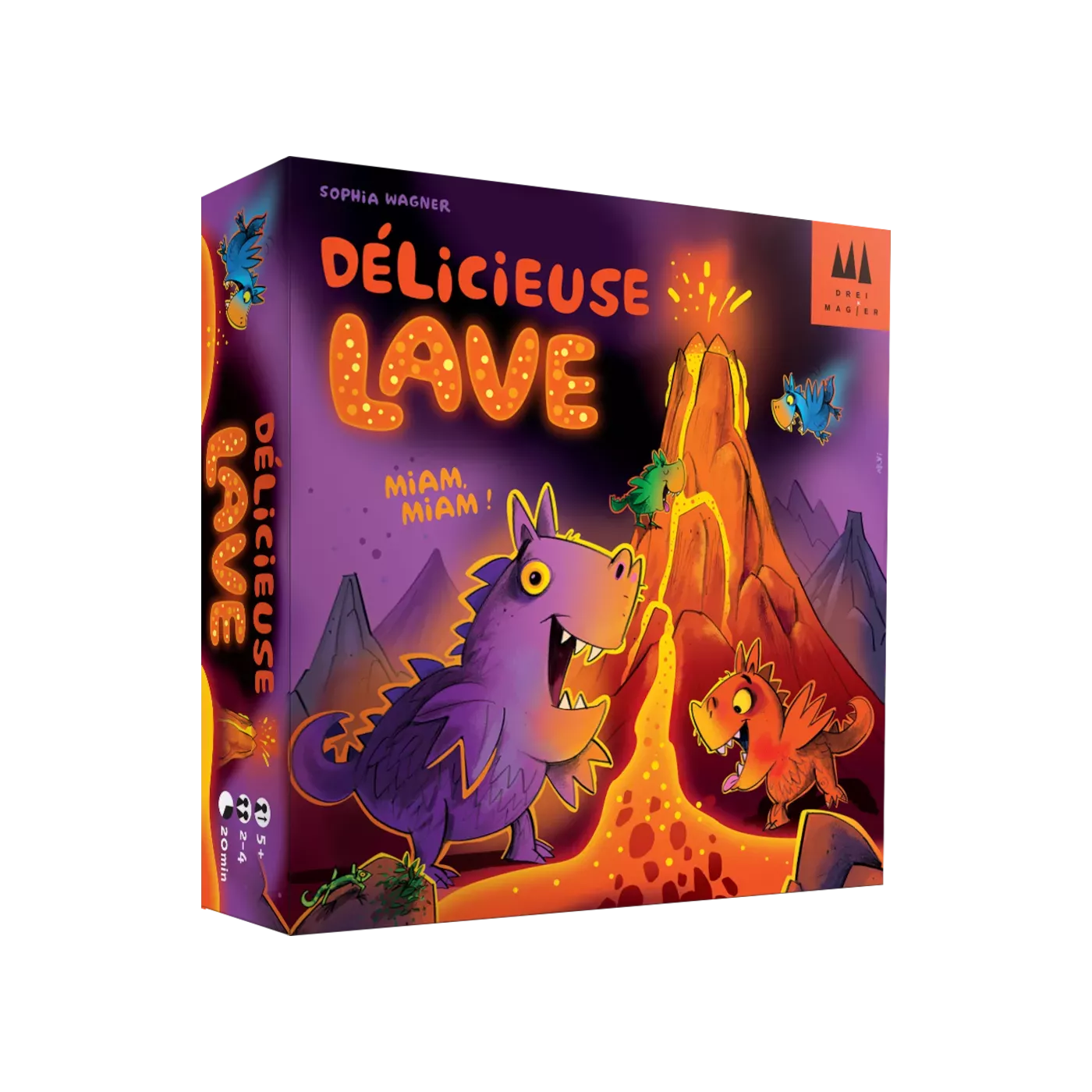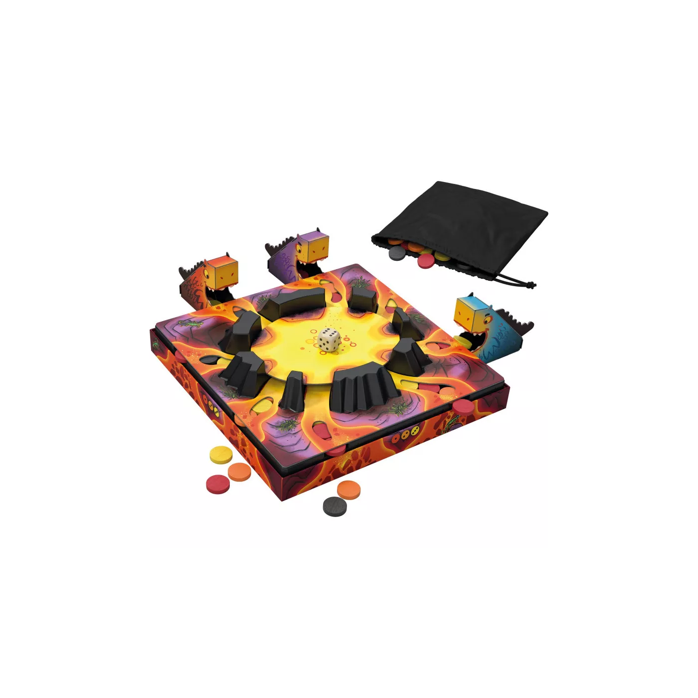 Les jetons sont cachés sous le plateau de jeu et ne sont que partiellement visibles. À chaque tour, une personne lance un dé, tire autant de nouveaux jetons "lave" du sac, puis les pousse sur le terrain de jeu. Mais avant de le faire, chaque joueur place son dragon en carton tridimensionnel, doté d'une gueule grande ouverte, devant l'une des ouvertures du plateau de jeu. Idéalement, les éclats de lave les plus précieux tomberont dans votre bouche, et vous éviterez les gris puisque ces éclats de lave froide vous coûteront un précieux jeton de points à la fin de la partie.