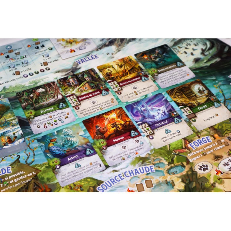 Vous pouvez placer un de vos ouvriers sur n'importe quel lieu de base, sur une carte de destination rouge de votre ville ou des villes adverses, à la Forge, aux Sources chaudes ou sur une balise au sommet d'une montagne, tant qu'elle n'est pas bloquée par la Neige ou un autre ouvrier. Récupérez ensuite les ressources indiquées ou effectuez l'action. S'il y a de la neige à cet endroit, vous devez d'abord dépenser une ressource Feu pour dégager le tas de neige. Si vous utilisez votre ouvrier Ranger unique, vous pouvez visiter un endroit occupé ou obtenir une ressource Feu si vous vous y rendez seul.