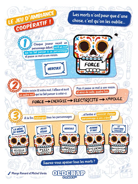 Les morts sont de retour dans Fiesta de los Muertos ! Choisissez un mot pour décrire votre personnage défunt, mais attention ce mot va passer de main en main, et se modifier peu à peu… Parviendrez-vous à retrouver votre personnage et celui des autres joueurs ?