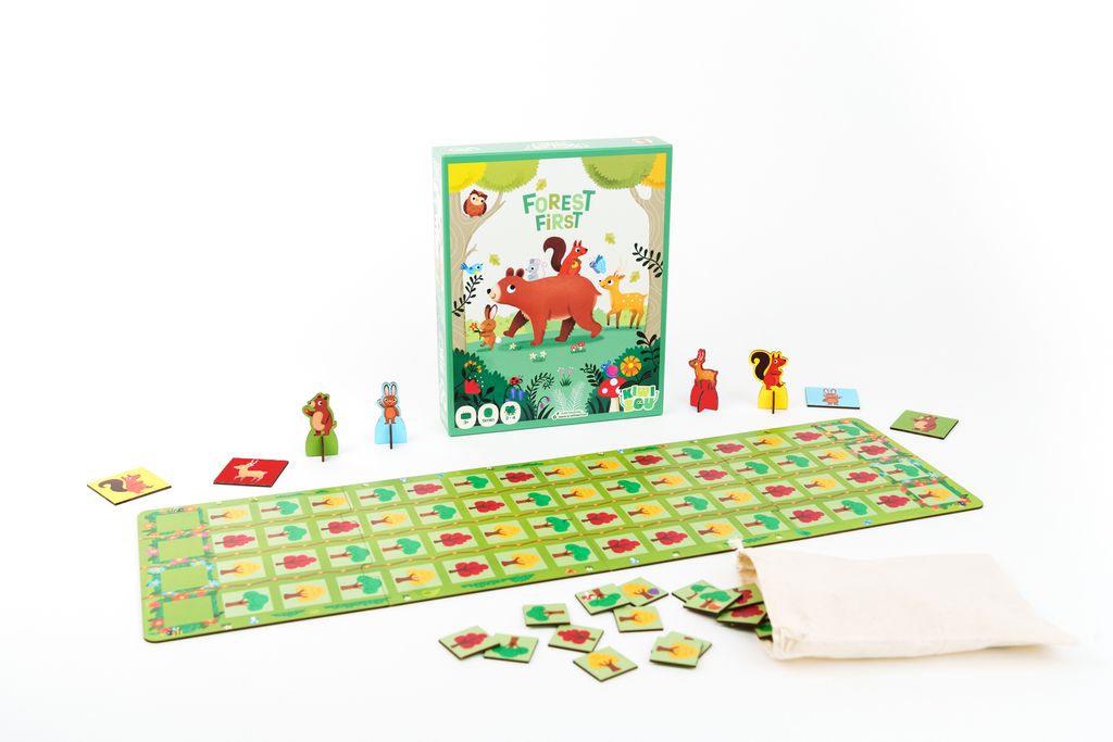 Un premier jeu pour les tout-petits rapide et très simple. Dans Forest First les joueurs incarnent des animaux de la forêt et font la course : le premier qui atteint le bout de sa ligne remporte la partie. Pour se déplacer pas besoin de manipuler un dé ou de compter des cases, les déplacements se font grâce à un système de couleur : la tuile tirée indique sur quel arbre avancer. Une mécanique qui évite la frustration ou l'attente de son tour de jeu, car tous les personnages avancent en même temps.