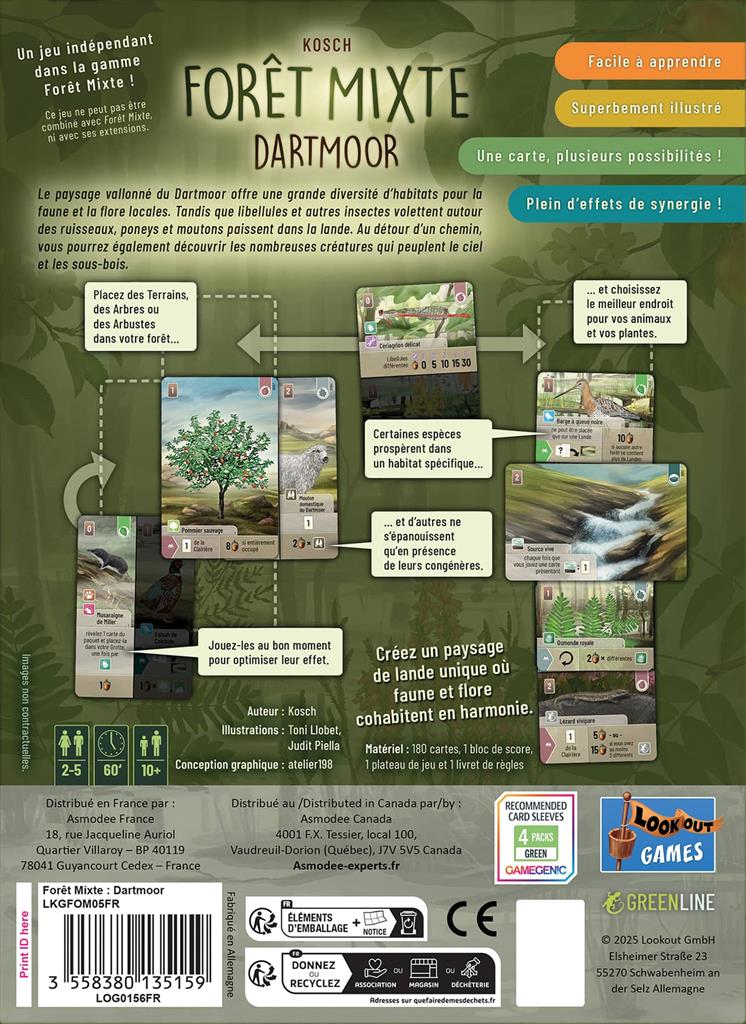 Avec ses 180 cartes finement illustrées, son matériel sans plastique et ses règles accessibles, Forêt Mixte : Dartmoor séduit les familles comme les amateurs de nature et de réflexion. Il s’agit d’un jeu indépendant de la gamme Forêt Mixte, idéal pour découvrir ou prolonger l’expérience.