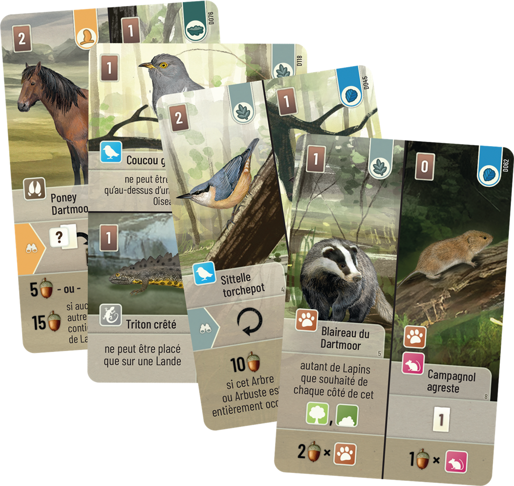 Chaque carte est une pièce du puzzle vivant que vous allez composer : certains animaux ont besoin d’un type de terrain spécifique (lande, rivière…), d’autres préfèrent être seuls ou entourés de leurs congénères. Mettez en place des synergies à effet immédiat ou persistant, profitez des bonus conditionnels et de la gestion de la clairière commune. Les cartes divisées en deux permettent un large éventail de choix.