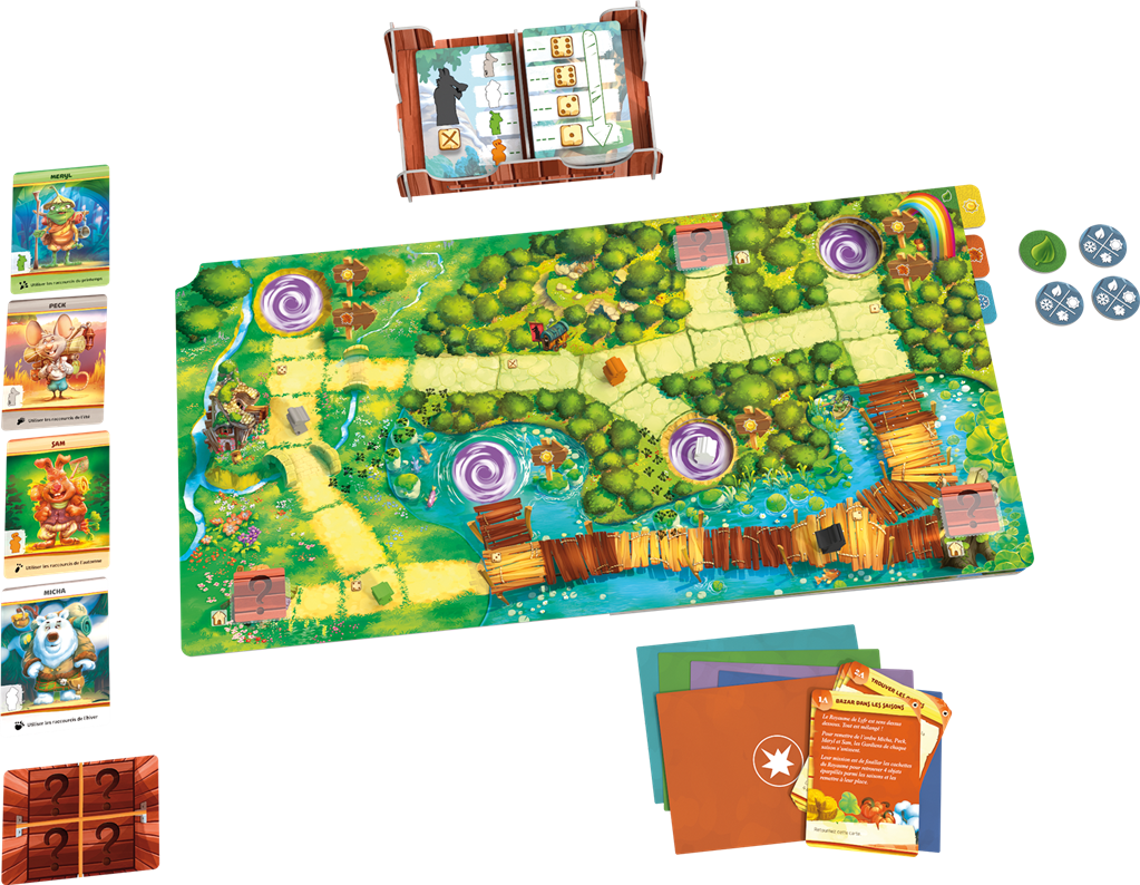 Coopérez en famille pour semer le loup ! Gardiens des Saisons est un jeu qui vous propose des histoires rejouables, en famille et avec les enfants, avec son lot de rebondissements, de rencontres et de missions spéciales. Partez à l’aventure en lisant la carte d’introduction et laissez-vous porter par le jeu ! Mais faites attention : le loup rôde et le temps vous est compté !