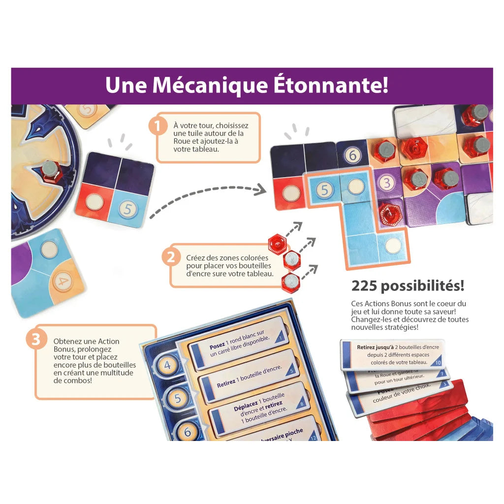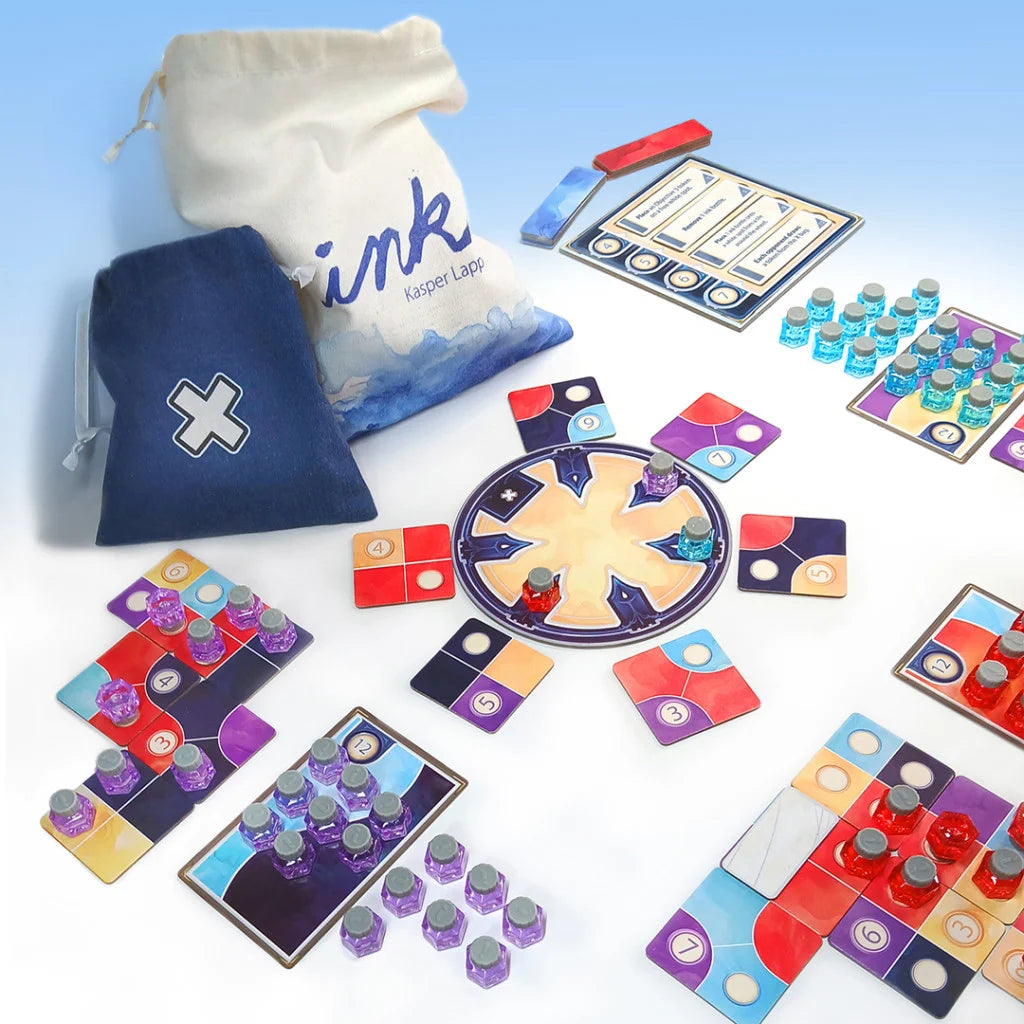 Ink est le jeu de tuiles où l'art et la stratégie vont de pair, et l'encre coule comme une rivière. Ink vous invite à déployer vos talents artistiques, mais aussi vos compétences tactiques. Grâce à un système de draft astucieux sur une roue, vous sélectionnez la tuile de couleur idéale dans votre stratégie. Avec les tuiles, vous pouvez créer des zones colorées sur votre tableau. Lorsqu'une zone est assez étendue et possède les emplacement adéquats, vous pouvez y déposer vos encriers. Cela déclenche une Action Bonus stratégique, qui peut vous permettre d'enchaîner les combos. Le premier joueur à placer tous ses encriers remporte la partie ! Facile à prendre en main mais demandant une vraie anticipation stratégique, ce jeu de gestion vous offre une expérience immersive et relaxante, dont les parties fluides durent une trentaine de minutes. De quoi contenter les stratèges les plus esthétes.