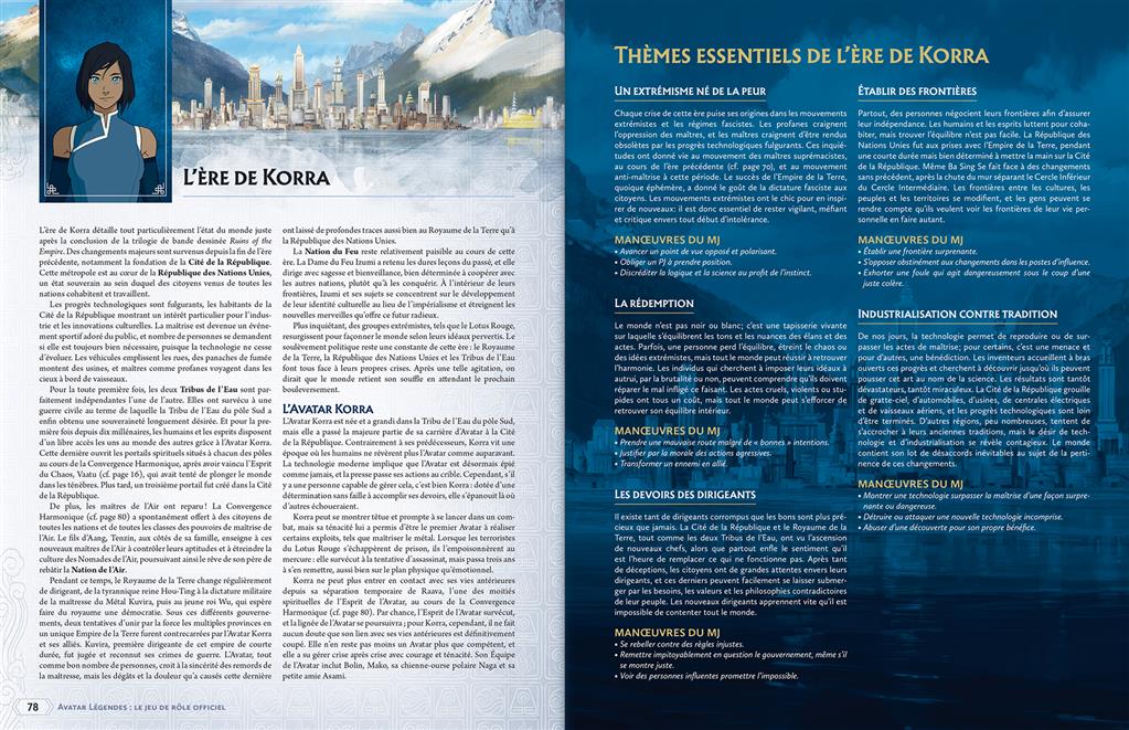 Avatar Légendes, le jeu de rôle officiel est un ouvrage en couvertue cartonnée de 312 pages tout en couleur qui contient tout ce dont vous avez besoin pour vous lancer dans l'aventure dans les Quatre Nations.