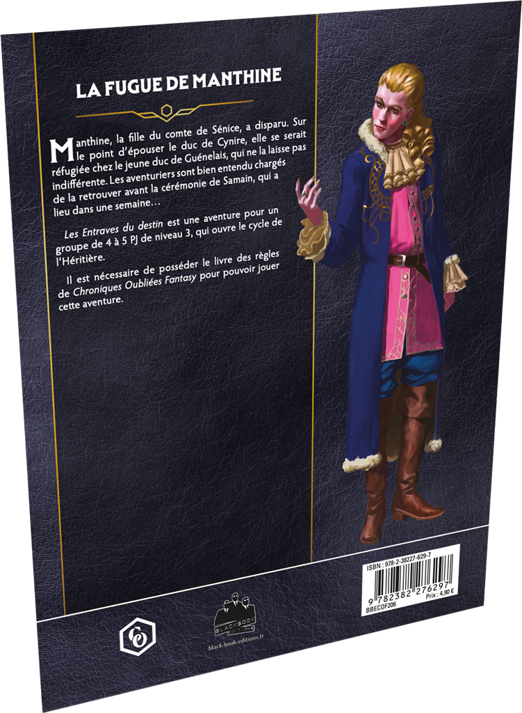 Manthine, la fille du comte de Sénice, a disparu. Sur le point d’épouser le duc de Cynire, elle se serait réfugiée chez le jeune duc de Guénelais, qui ne la laisse pas indifférente. Les aventuriers sont bien entendu chargés de la retrouver avant la cérémonie de Samain, qui a lieu dans une semaine… Les Entraves du destin est une aventure pour un groupe de 4 à 5 PJ de niveau 3, qui ouvre le cycle de l’Héritière.