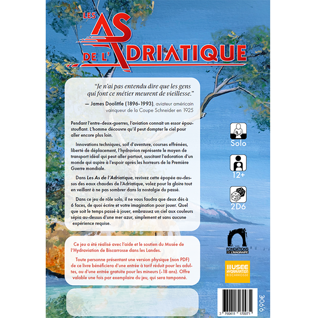 Ce jeu a été réalisé avec l’aide et le soutien du Musée de l’Hydraviation de Biscarrosse dans les Landes. Toute personne présentant une version physique (non PDF) de ce livre bénéficiera d’une entrée à tarif réduit pour les adultes, ou d’une entrée gratuite pour les mineurs (-18 ans). Offre valable une fois par exemplaire du jeu, qui sera tamponné.