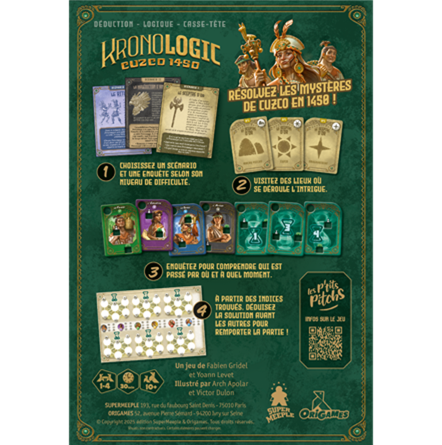 Après le succès de Kronologic - Paris 1920, résolvez les enquêtes à Cuzco, en 1450. Enquêtrices, enquêteurs, c’est à vous de démêler une série de mystères inexpliquées qui ont toutes eu lieu à Cuzco, au Pérou. Chacune des enquêtes, à la complexité variable, mettra à l’épreuve votre perspicacité et vos compétences de déduction logique. Qui ? Où ? Quand ? Votre objectif est de résoudre chaque mystère avant les autres, et de rétablir la vérité.