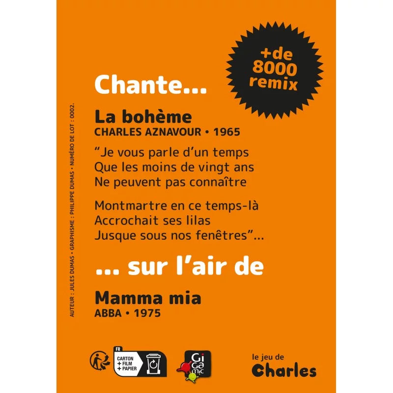 Enfin un jeu pour celles et ceux qui chantent comme des casseroles ! Le jeu de Charles, c'est le mélange parfait entre blind test et karaoké. L'objectif est simple : chanter les paroles d'une chanson sur l'air d'une autre et faire deviner le tout à votre auditoire ! 128 cartes pour plus de 11 000 remix possibles, vous n'avez pas fini de chanter !