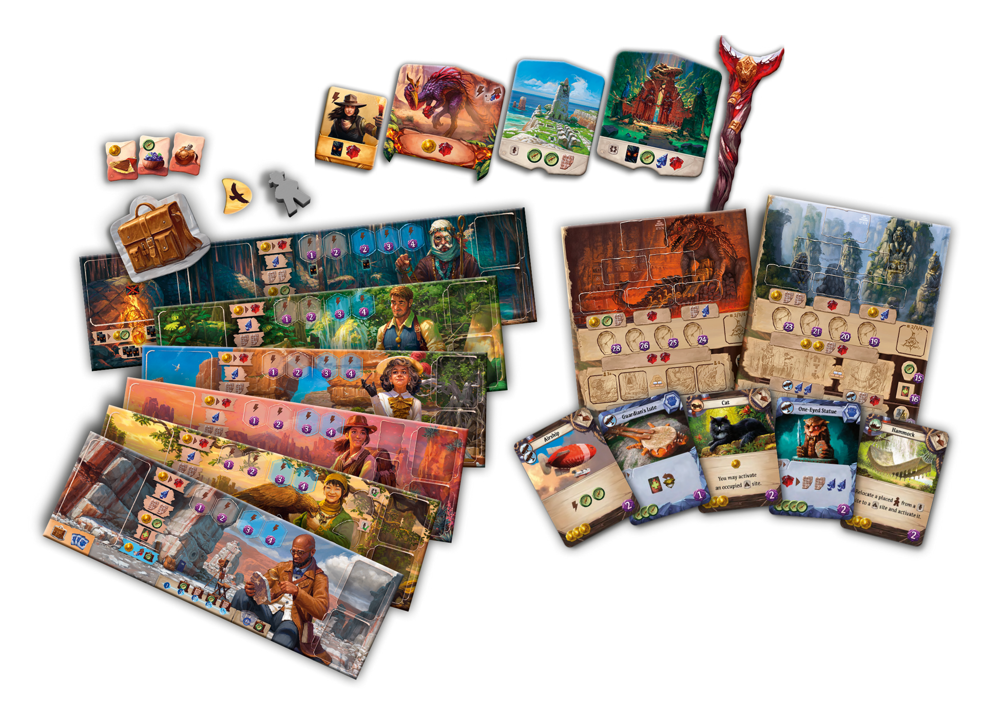 • Contenu : 6 plateaux individuels, 24 cartes Chef d'Expédition, 18 cartes Objet, 12 cartes Artefact, 1 piste Recherche recto/verso, 8 sites archéologiques, 6 jetons Rôle, 5 gardiens, 4 idoles, 4 tentes, 3 assistants, 1 sceptre lunaire, 1 pion Archéologue gris, 1 tuile Aigle, 1 tuile Sacoche, 3 jetons Collation et 1 livret de règles.
