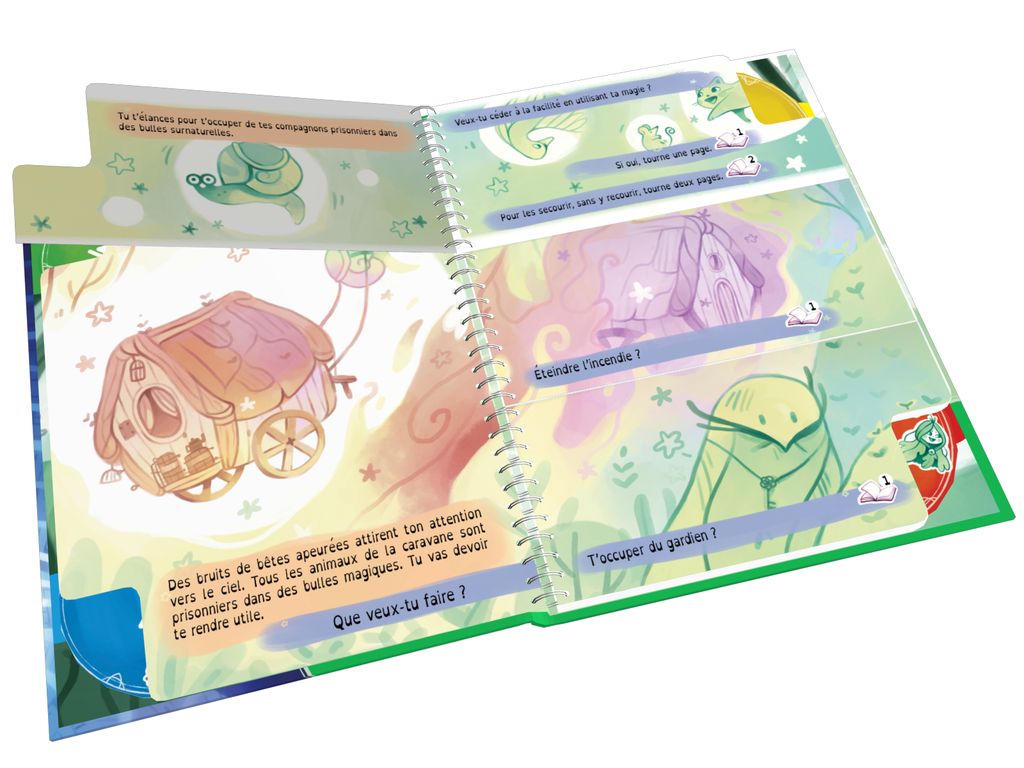 Crée ta propre histoire : à chaque page coupée en trois, tu devras faire un choix. Ouvre le livre et choisis-le magicien ou la magicienne que tu souhaites incarner : Lilon l’elfe des airs, qui vole et soigne toutes les misères ? Camille l’ensorceleuse, maîtresse des glaces pas frileuse ? Lucien le pyromancien, qui dompte les flammes au quotidien ? Maintenant, ton aventure peut commencer. Tu vas pouvoir lire ce livre normalement, de gauche à droite, mais rapidement, tu feras face à des choix matérialisés par des pages coupées en trois. Tourne la partie de ton choix et découvre ce qui va se passer. Après plusieurs choix, tu arriveras à la fin de ton aventure… Réussiras-tu à récupérer le Livre du Savoir de ton peuple ? Une fois la lecture terminée, tu peux recommencer pour découvrir de nouveaux chemins et/ou essayer avec un autre personnage.