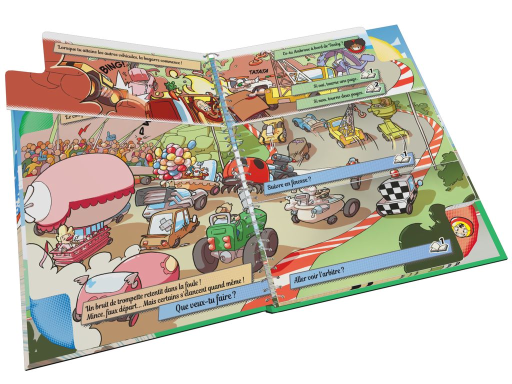 Crée ta propre histoire : à chaque page coupée en trois, tu devras faire un choix. Ouvre le livre et choisis ton pilote et son véhicule : Ambrose à bord de Tanky, son char blindé ? Bip-Bop dans sa Futuro-Mobile, la merveille technologique ? Ou Haru et son Éclair Rouge, le super bolide ? Maintenant, ton aventure peut commencer. Tu vas pouvoir lire ce livre normalement, de gauche à droite, mais rapidement, tu feras face à des choix matérialisés par des pages coupées en trois. Tourne la partie de ton choix et découvre ce qui va se passer. Après plusieurs choix, tu arriveras à la fin de la course… Seras-tu le nouveau champion de la course des Casse-tout ? Une fois la lecture terminée, tu peux recommencer pour découvrir de nouveaux chemins et/ou essayer avec un autre personnage.