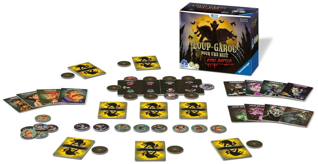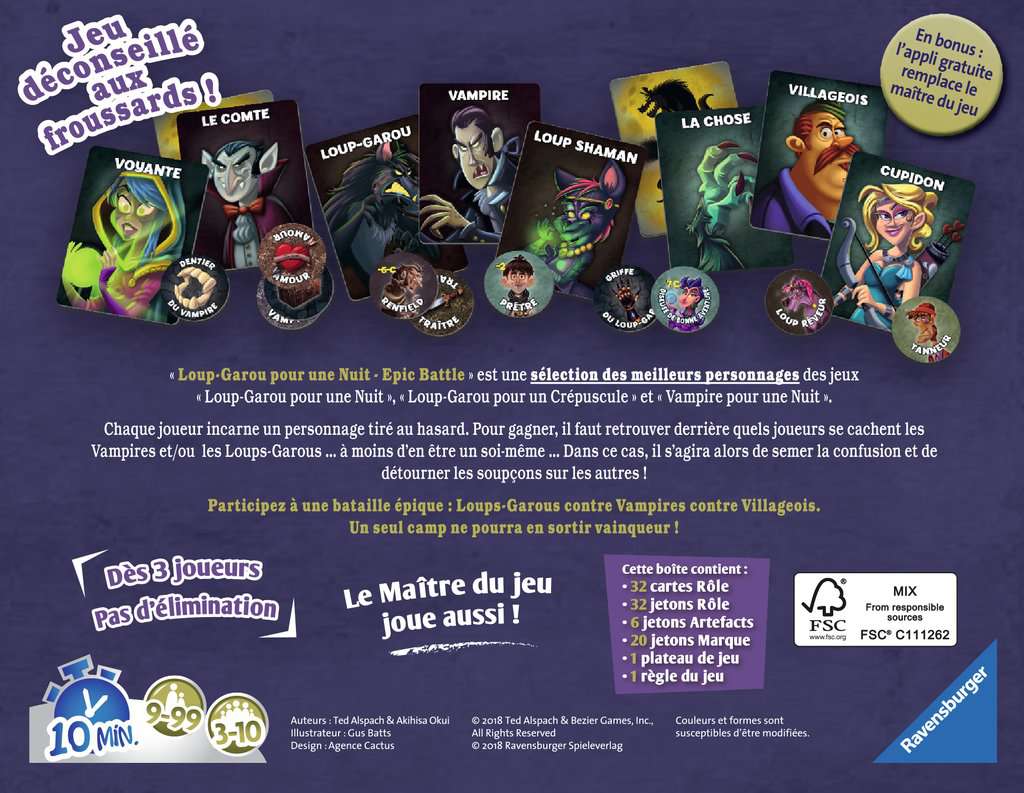 Vous savez feinter et manipuler d'une main de Maître ? Vous pensez que personne ne peut rien contre vous ? Alors vous avez frappé à la bonne porte ! Le soleil vient de se coucher. Vampires et Loups-garou chassent dans le village endormi, mais très vite tout dérape ! Heureusement certains villageois sont dotés de capacités hors du commun ! Glissez dans la peau de l'un des 30 personnages et soyez à l'affût ! Mais qui est un honnête villageois et qui est un terrible Loup Garou ou un Vampire aux dents longues ? À vous de le découvrir ! Epic Battle pack regroupe les 30 meilleurs personnages de Loup Garou pour Une Nuit, Loup Garou pour un Crépuscule et Vampire pour Une Nuit ! Vous êtes désormais prêt pour un affrontement de bluff entre créatures mystiques ! Également adapté aux petits groupes, pas d'élimination, le Maître du jeu joue aussi. En bonus : l'appli gratuite remplace le Maître du jeu ! Dès 9 ans.