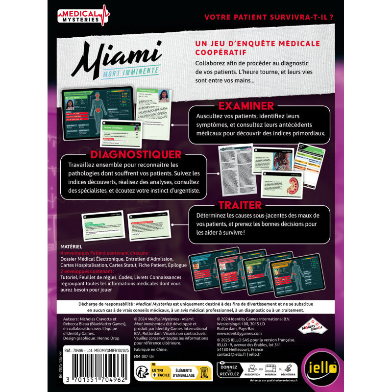 En tant que médecin urgentiste, votre travail consiste à examiner les symptômes mystérieux de vos patients, à examiner leurs antécédents médicaux et à découvrir des indices cachés. Travaillez ensemble pour diagnostiquer les conditions. Suivez les pistes, effectuez des tests, consultez des spécialistes et utilisez votre instinct pour diagnostiquer le patient. Afin de connaître le résultat de vos analyses et examens sur le patient vous devrez consulter un codex, qui vous indiquera la conséquence de vos actions en fonction de l’heure, et donc de l’état général du patient. Votre capacité à prendre les bonnes décisions vous permettra de marquer des points, ce qui influera sur votre réussite finale.