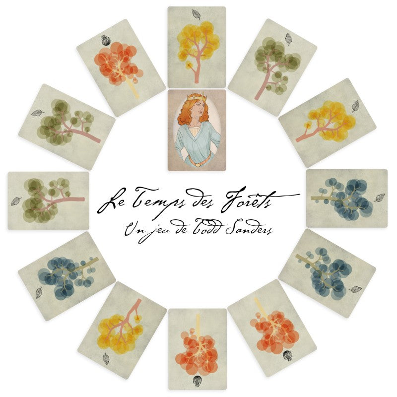 Pour commencer, mélangez les douze cartes d'arbre et placez-les dans un anneau comme le cadran d'une horloge. Toutes les cartes doivent avoir leur côté fleuri révélé et les troncs doivent être orientés vers le centre de l'anneau. Chaque carte représente également l'un des quatre objets. Placez la carte « jeune fille » à l'intérieur de l'anneau, à la position 12 heures.