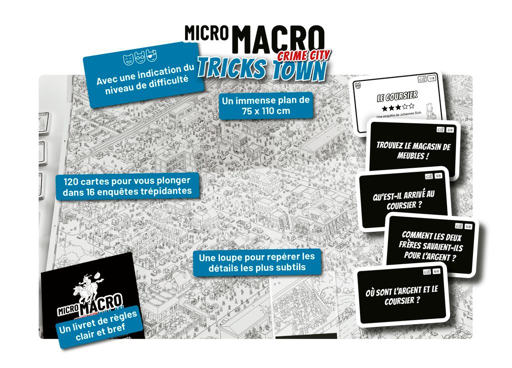 Tricks Town est le troisième volet de la série MicroMacro. Venez y découvrir une nouvelle partie de la ville, avec ses 16 enquêtes inédites et plus corsées à mener. Ce jeu est indépendant des premiers volets : il n‘est pas nécessaire de posséder ou d‘avoir joué aux épisodes précédents pour vous lancer dans ces nouvelles affaires !