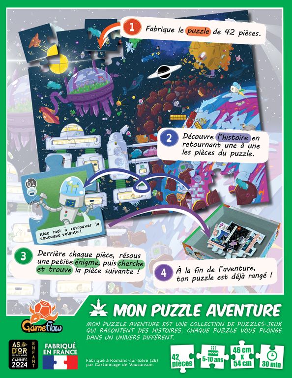 « Mon Puzzle Aventure » est le renouveau d'un classique : le puzzle. Réalise le puzzle puis, une fois les 42 pièces placées, retire-les dans l'ordre et découvre l'histoire en les retournant. Chaque nouvelle pièce donne l'indice pour trouver la suivante.