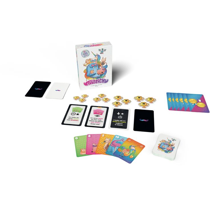 Moustache est un jeu de plis à rebondissements, pour 3 à 6 joueurs. À chaque manche, les équipes sont redéfinies aléatoirement et une nouvelle règle vient chambouler la partie : hiérarchie des couleurs inversée, jokers délirants, effets de cartes... Rien n’est jamais figé ! Grâce à un système de règles évolutives et de cartes Équipe, chaque partie est unique et pousse à l’adaptation constante. On y retrouve le plaisir immédiat du jeu de plis, enrichi d’un goût de chaos contrôlé. Facile à apprendre, drôle à jouer, idéal pour animer une soirée famille ou amis.