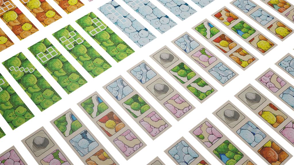 Les tuiles sont des ‘triples’ dominos remplis de 3 parcelles correspondant aux saisons (plus du sable). Posez-en une à votre tour, de manière orthogonale, et en recouvrant au minimum une ou deux parcelles déjà présentes. Ce faisant, vous formerez peut-être les motifs demandés par les Objectifs !