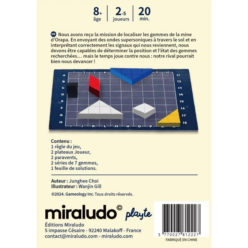 Orapa Mine est un jeu de déduction coréen. Tout comme dans une bataille navale, les joueurs doivent deviner le placement des objets de l'adversaire. C'est là que s'arrête la comparaison car les objets d'Orapa Mine sont des gemmes sur lesquels se reflètent un faisceau lumineux. Le gemme, en fonction de sa forme et de sa teinte, dévie le faisceau et en modifie la couleur.