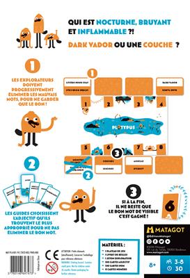 Acide ? Dangereuse ? Énervante ? Une vendeuse de voitures ! Comestible ? Rapide ? Souple ? Captain America ou une autruche ? Dans Platypus, les joueurs coopèrent pour éliminer progressivement les mauvais mots, afin de trouver et d'identifier le Platypus grâce à leurs cartes Adjectif. Entre définitions très personnelles et cartes en main limitées, il faudra parfois avoir de l’intuition et même de l’imagination !