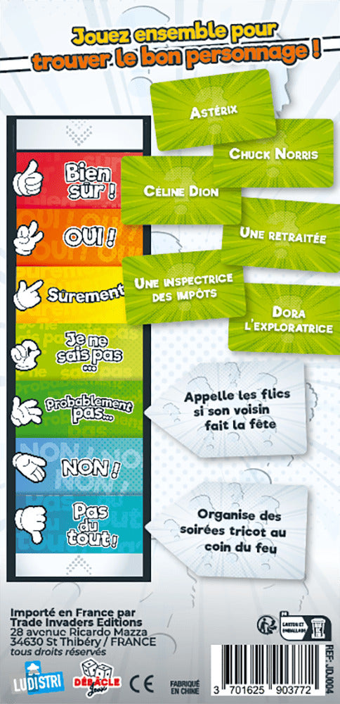 Le Profiler, quant à lui, doit faire deviner son personnage en plaçant 2 cartes le long d’une jauge. Par exemple, il évaluera la carte « manque de maturité » pour Chuck Norris sur une échelle de « Absolument pas ! » à « Évidemment ! » !