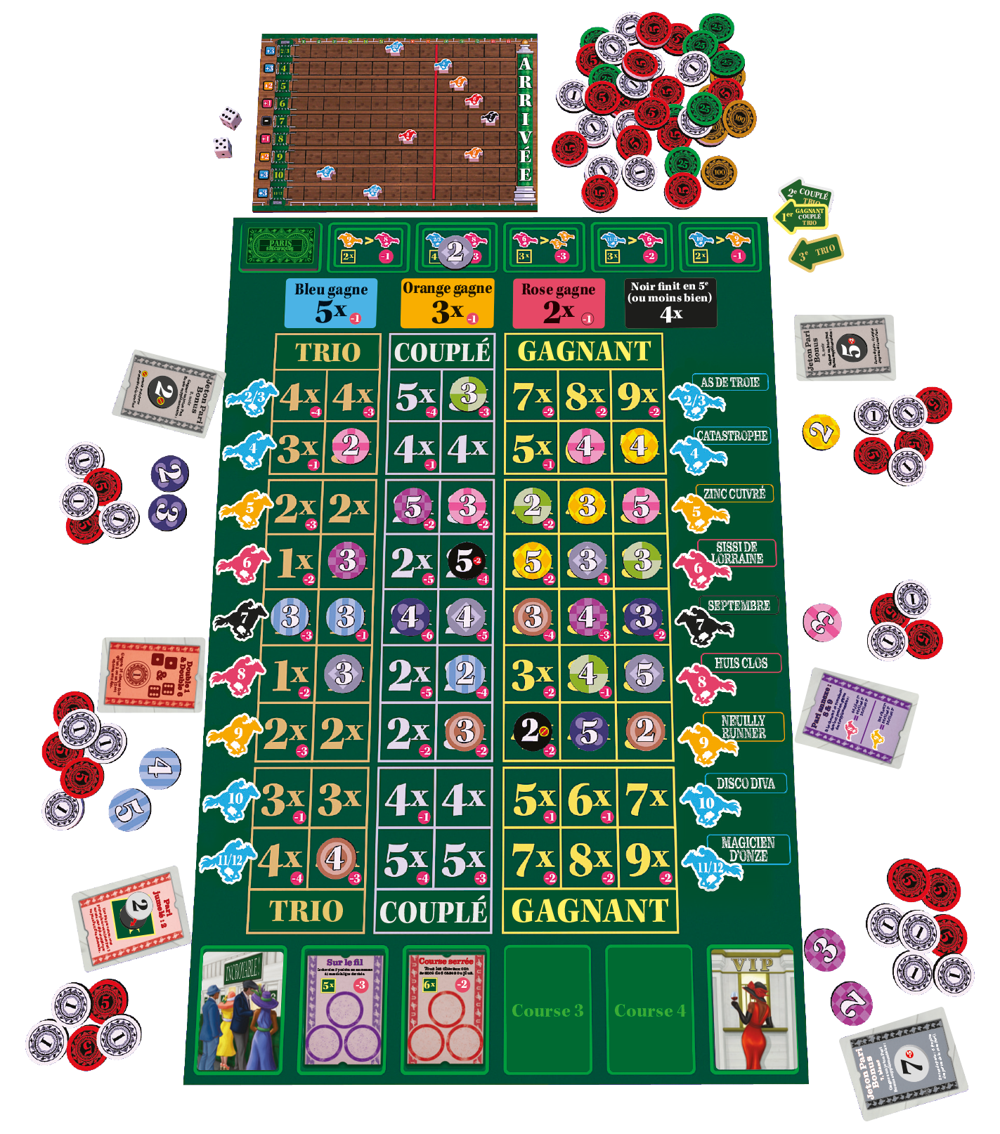 Le jeu se déroule en quatre courses, pendant lesquelles vous découvrirez à chaque fois de nouveaux paris disponibles, afin d’assurer la variété des courses. Après chaque manche, les joueurs gagnent ou perdent de l'argent pour chacun de leurs jetons de pari placés, puis reçoivent une carte de club VIP pour les aider à gagner plus d'argent dans les courses suivantes. Après quatre manches, le joueur avec le plus d'argent remporte la partie