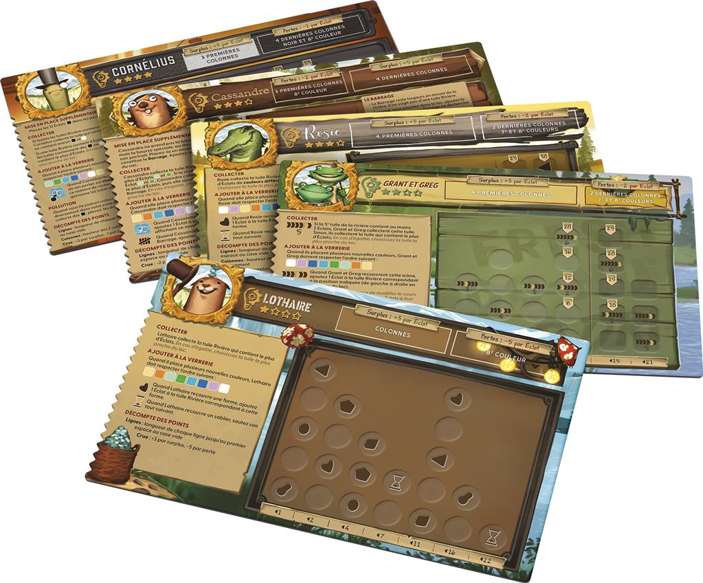 Votre objectif est de remplir votre verrerie en y plaçant au mieux des Éclats de verre collectés dans la rivière. À chaque tour de jeu, placez un des éclats de votre bourse vers une tuile rivière (en respectant les impératifs de forme), puis ramassez les éclats d’une tuile adjacente, ou bien remplissez votre bourse en prenant 4 des 5 éclats présents dans le lac. Prenez garde à ne pas trop en ramasser au risque d’être victime de crue, ce qui vous couterait des points en fin de partie.