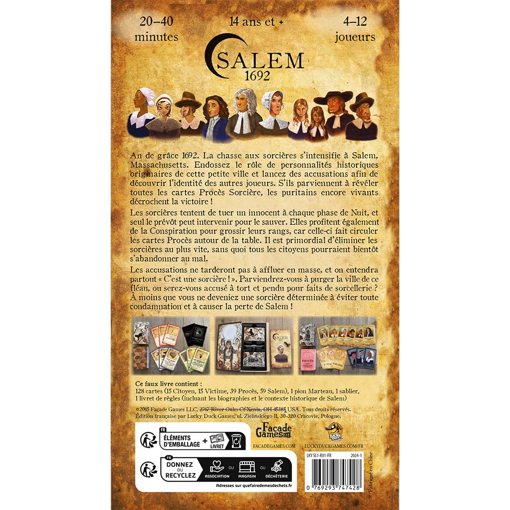 An de grâce 1692. La chasse aux sorcières s’intensifie à Salem. Les joueurs, qui incarnent tous une personnalité historique originaire de cette petite ville, multiplient les accusations pour révéler les cartes Procès de leurs adversaires. S’ils parviennent à exposer ainsi toutes les sorcières, les citoyens encore en vie remportent la victoire !