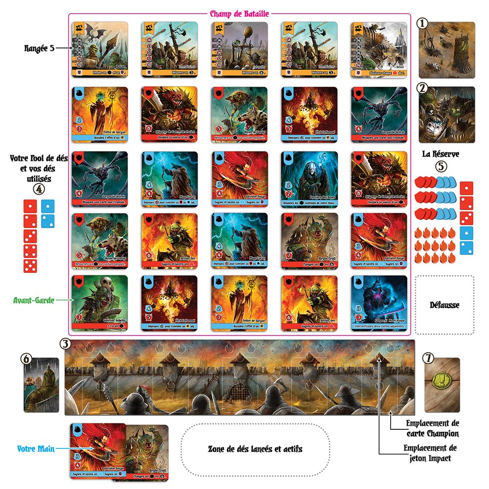Pour faire face, vous n’aurez que vos dés et votre sens du combat ! Mais chaque fois que vous éliminerez une créature, celle-ci vous octroiera un effet primordial pour mieux vaincre les monstres des Sombres Royaumes. Combinez vos effets de cartes et vos dés pour optimiser vos attaques… sinon votre muraille pourrait bien céder !
