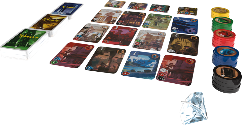 Dans Splendor, vous dirigez une guilde de marchands. À l’aide de jetons symbolisant des pierres précieuses, vous allez acquérir des développements qui produisent de nouvelles pierres (les bonus). Ces bonus réduisent le coût de vos achats et attirent les nobles mécènes.