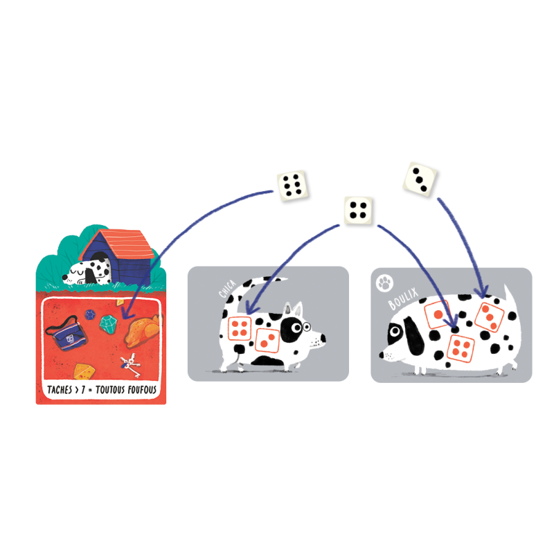 Spots ou Encore", un jeu de société irrésistible avec des petits toutou qui allie simplicité et stratégie pour des moments de jeu conviviaux. Ce jeu vous plonge dans une compétition amusante où vous devrez compléter vos cartes Toutou en plaçant des dés sur les bons tâches ! Placez vos dés sur les bons spots pour compléter vos toutous ! Dans "Spots ou Encore", chaque joueur reçoit des cartes Toutou qu'il doit compléter en plaçant des dés sur les spots correspondants. Les cartes sont dotées de motifs de taches, et le but est de recouvrir ces taches avec les dés appropriés. Chaque tour, vous choisissez une tuile Tour et suivez les actions indiquées, qui peuvent impliquer de lancer des dés, de les placer sur vos toutous, ou de les enterrer sous votre niche si vous ne pouvez pas les utiliser. Le jeu est à la fois simple à comprendre et suffisamment stratégique pour maintenir l'intérêt des joueurs au fil des parties. Maîtrisez les tours, gérez vos dés, et évitez que vos toutous ne deviennent foufous ! Le jeu se déroule en tours, où chaque joueur choisit une tuile Tour disponible et réalise les actions indiquées. Vous devrez lancer des dés et tenter de les placer sur les spots de vos toutous. Si vous ne pouvez pas placer un dé, il doit être enterré sous votre niche. Attention, si le total des taches de vos dés enterrés dépasse 7, vos toutous deviennent "foufous" et vous perdez tous les dés placés sur vos cartes Toutou. La première personne à valider 6 cartes Toutou remporte la partie, mais gare aux rebondissements que peuvent provoquer les dés et les tuiles spéciales ! Des illustrations loufoques et un design soigné pour un plaisir visuel garanti ! "Spots ou Encore" séduit non seulement par son gameplay engageant, mais aussi par son esthétique adorable et originale. Les illustrations de John Bond apportent une touche de légèreté et de charme. Chaque élément du jeu, des cartes Toutou aux tuiles Tour, est conçu avec une attention particulière aux détails, avec même des toutous de nos collègues préférés ! Un jeu de société accessible et stratégique "Spots ou Encore" est un jeu qui combine simplicité, stratégie et charme visuel pour offrir une expérience de jeu complète et agréable. En maîtrisant les règles, en optimisant vos lancers de dés et en évitant que vos toutous ne deviennent foufous, vous pourrez peut-être remporter la victoire.