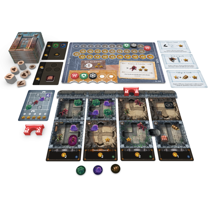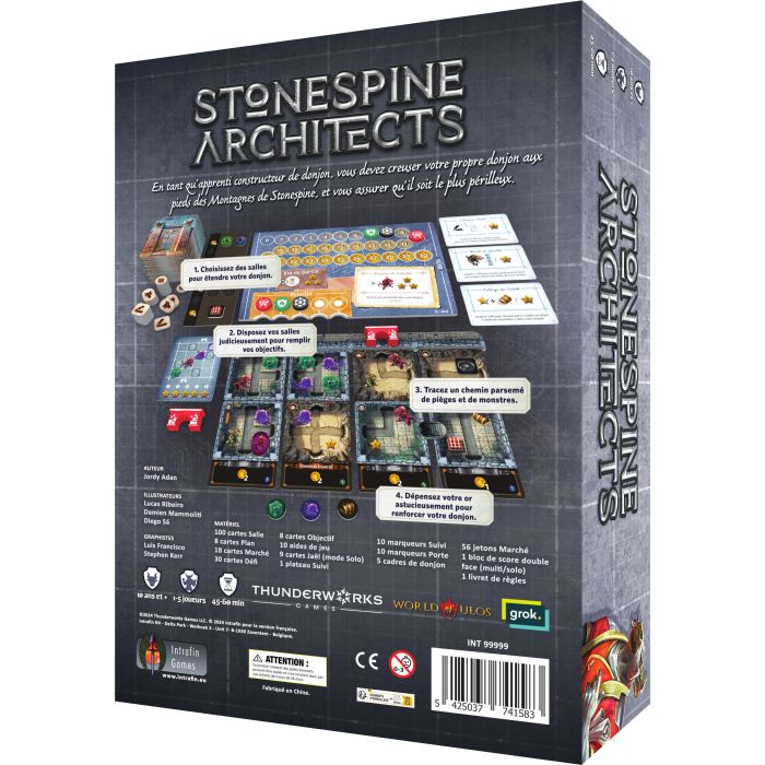 Stonespine Architects est un jeu de sélection de cartes pour 1 à 5 joueurs où vous concourez pour construire le labyrinthe le plus dangereux. Pendant quatre ans, les joueurs sélectionnent des cartes pour développer leurs donjons, en suivant un plan et en relevant divers défis de points. Vous pouvez tracer des chemins, ajouter des éléments clés et chercher des trésors. Entre les tours, dépensez de l'or pour personnaliser votre labyrinthe avec des monstres, des pièges et des passages secrets. Le joueur avec le donjon le plus périlleux à la fin du jeu remporte le titre de Maître Architecte !