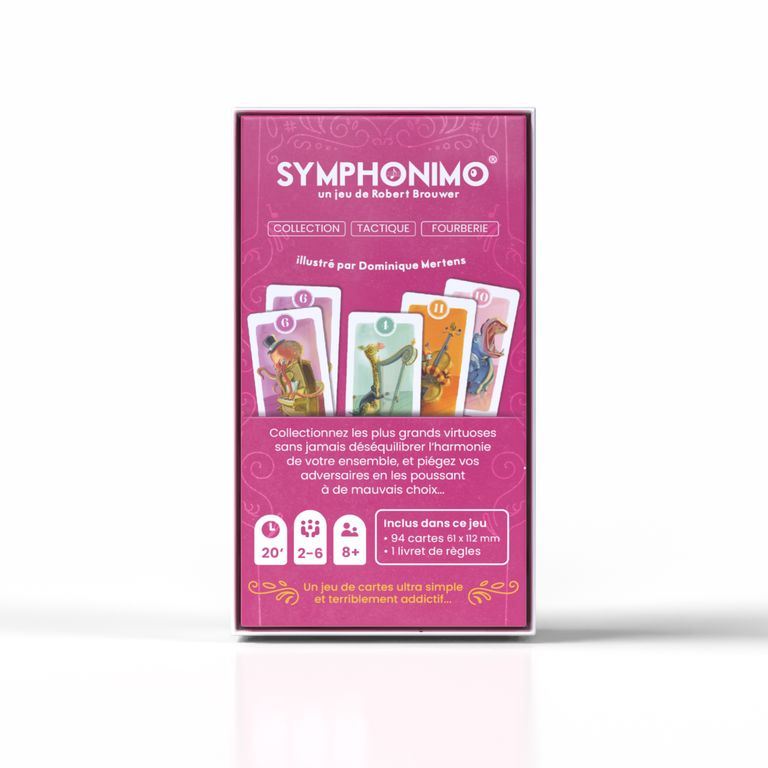 Collectionnez les plus grands virtuoses sans jamais déséquilibrer l’harmonie de votre ensemble, et piégez vos adversaires en les poussant à de mauvais recrutements... Avec son design élégant et ses splendides illustrations , Symphonimo est un petit jeu de collection simple, fourbe et addictif !
