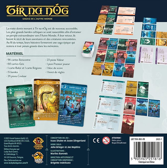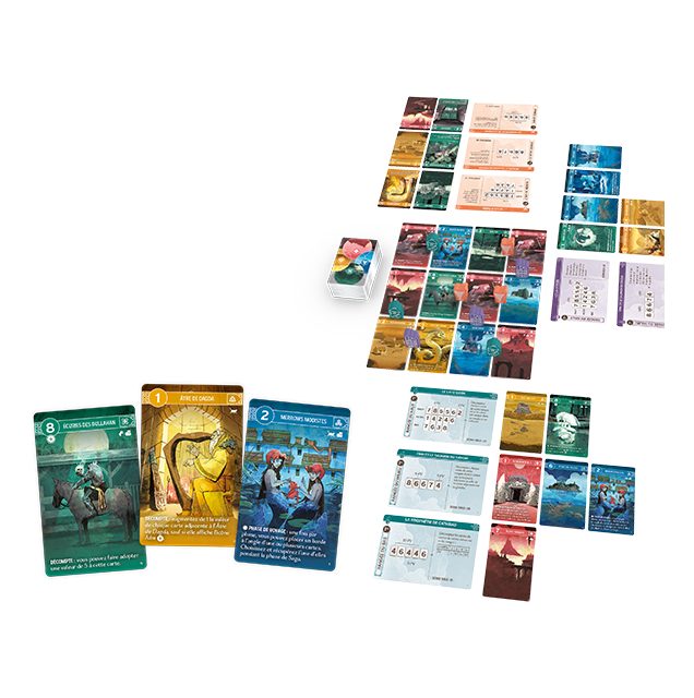 Placez vos bardes entre les cartes d’histoires dans une grille partagée. Lorsque tous sont placés, dans l’ordre inverse du tour, “draftez” les cartes. Depuis votre main, jouez-les sur votre tableau personnel. En fin de partie, marquez vos points dans chaque saga et suivant les cartes de même couleur connectées ! Interactions, réflexions et décisions permanentes.